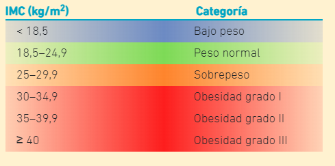 El IMC pone el peso en relación con el cuadrado de la altura corporal (kg/m²). Con el IMC se puede clasificar el peso corporal según las clases de peso de la OMS.